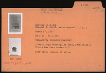 | Description: | A small high rectangular base, from which a figure has been broken off. Remains of white color. Buff clay. | |