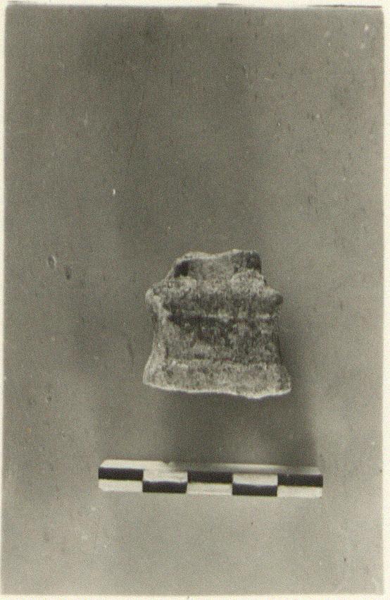 | Description: | A small high rectangular base, from which a figure has been broken off. Remains of white color. Buff clay. | |