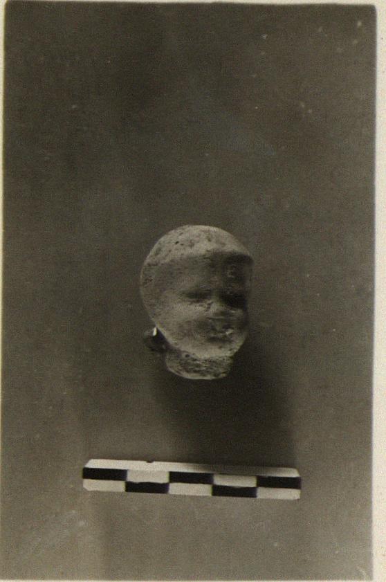 | Description: | Broken away at neck. Head of a child with fat cheeks. The hair smooth. The features not sharp. Solid. Traces of white slip. | |