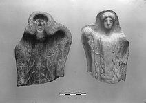 The right shoulder, which is complete, rises well above the bottom of the neck and ends in a knob. No trace of arm or attachment for arm. Perhaps front part of a wing (?) Drapery at sides finely represented in flat diamond shaped folds.