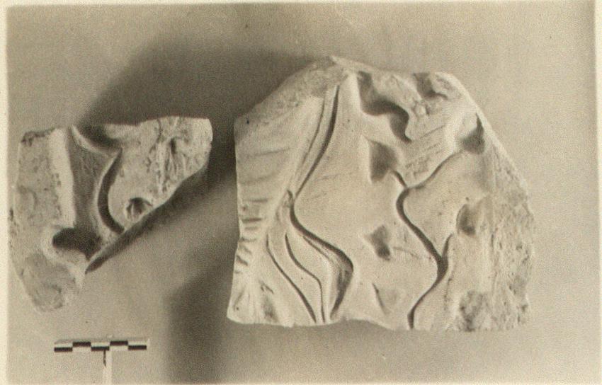 | Description: | Fragment a) part of one side, with raised edge (broken off) preserved. Along the side, ivy vine; beside in drapery (?) Heavy fabric. Pink clay, buff at surface and with fine buff slip inside. Fragment b) from a very similar mould; part of the raised edge preserved, and a bit of vine inside it. Heavy fabric. Buff slip inside and on edge. Orange clay with red bits. | |