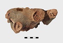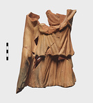 | Description: | Head and shoulders, much of upper body, left arm, and legs from knees missing. Figure wearing a short chiton reaching only to the knees. It has an overfold and is girt diagonally, over the left shoulder and with a band under the left arm. Across the back, as if held in place by this arrangement, is a cloak which is drawn round to envelop the right arm which hangs at the side, the hand slightly outstretched, and the drapery, which conceals it, falling in a heavy fold at the side. Fragmentary. No certain remains of white color. Hard red clay; red to buff surface. Cf. Head T 1409. | |