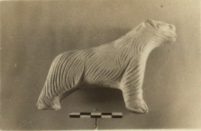 | Description: | Intact rattle in shape of bear walking. Inside, several small pellets. The two hind legs are joined together; the left foreleg is added separately by hand. Details gouged. Mold made lengthwise in two pieces. A small vent hole in belly near hind legs. Slight traces of white color in mouth. Pinkish buff clay. | |