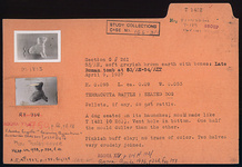 | Description: | Rattle in shape of dog seated on its haunches. Pellets, if any, do not rattle. Vent hole in bottom. Mold made like T 1421 (lengthwise in two pieces). One half of the mold duller than the other. Two halves very crudely joined. No trace of color. Pinkish buff clay. | |