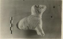 | Description: | Rattle in shape of dog seated on its haunches. Pellets, if any, do not rattle. Vent hole in bottom. Mold made like T 1421 (lengthwise in two pieces). One half of the mold duller than the other. Two halves very crudely joined. No trace of color. Pinkish buff clay. | |