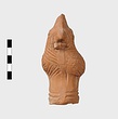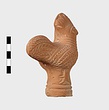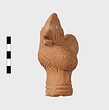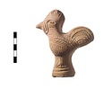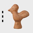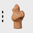 | Description: | Rattle in shape of cock on high roundish base. Pellets inside. Mold made as T 1421-1422 (lengthwise in two pieces). Small vent hole under tail. Details elaborately gouged. No trace of color. Pinkish buff clay. | |