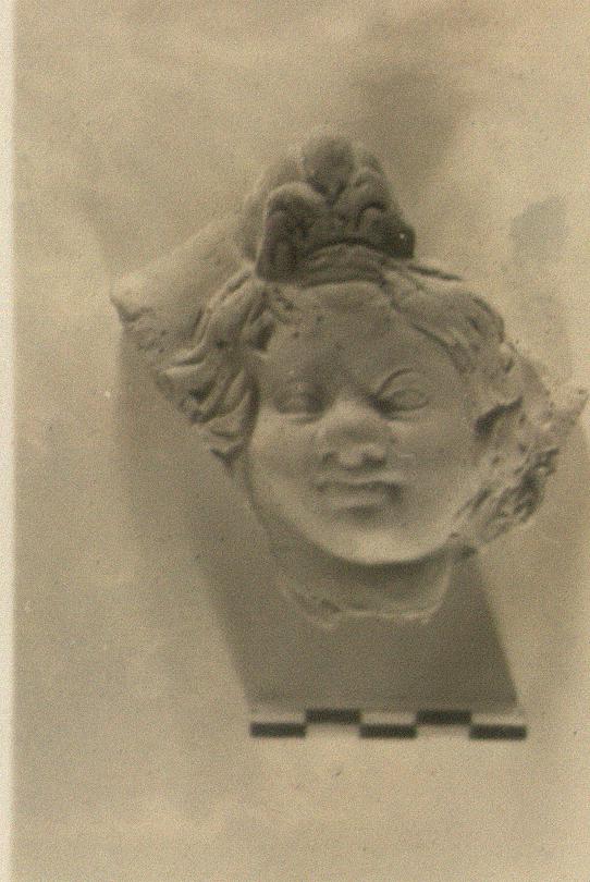 | Description: | Face in high relief of a fat faced smiling child. His curly hair is pulled up into a top-knot over his forehead, which is crowned by a petal braced by volutes (?) (equal to Harpokrates ornament ?). No color. Pale buff clay. | |