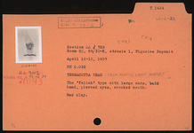 | Description: | The "fellah" type with large ears, bald head, pierced eyes, crooked mouth. Red clay. ADDENDA: Probably from plastic lamp. | |