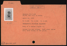 | Description: | Body of figure. Broken top and bottom. White slip with traces of red paint. Buff clay. | |