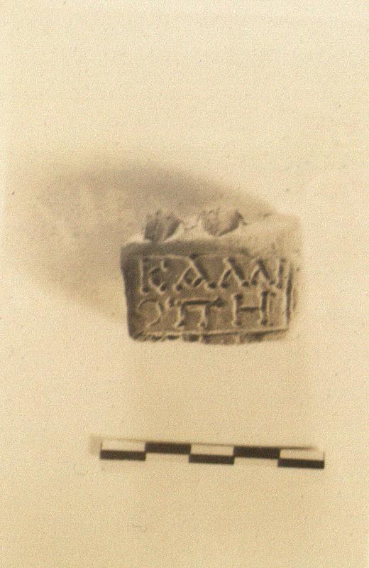 | Description: | Two feet in pointed shoes on a rectangular inscribed base for Muse Kalliope figurine. The inscription in two lines: Κ Α Λ Λ Ι Ο Π Η Traces of white color. Red clay. <graphic> | |