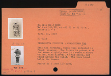 | Description: | Head and forearms, which were extended in front, missing. The figure is poised with the knees slightly bent. It wears a short chiton, with sleeves, to the knees, and bound around the waist. The legs bound below the knees. Fabric as T 1469 (red clay; somewhat micaceous). | |