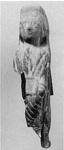 | Description: | Lower right part missing. Figure with high headdress, holding a square tablet in lap. Features must have been largely done with paint for the modelling is confined to a general outline of the face and a bump for the nose. Color on upper part of the body fairly well preserved (front only, back never colored, or even modelled): on a white background, vertical stripes, left to right, red, green, yellow, red (center), yellow, green, red. Traces of color on skirt also; diagonal stripes of green, yellow, red. Clay fired hard, brownish in color. Late Roman. | |