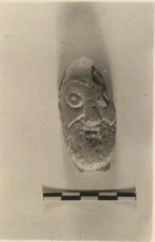 | Description: | A bearded head. Gouged style. Remains of white paint. | |