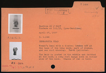 | Description: | Woman 's head with diadem. Broken off at the base of the long neck; part of diadem, and one curl missing. The hair is parted in the middle and knotted at the back. A long curl hangs down on either side of the neck. Teeth indicated. Traces of red color on hair. | |