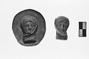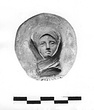 Rounded back. Head cut off at base of neck. Veil wrapped so as to frame face.