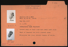 | Description: | Mask of bearded man with pierced eyes. Broken away at hair line and lower left side. Slight traces of white paint. Micaceous red clay. | |