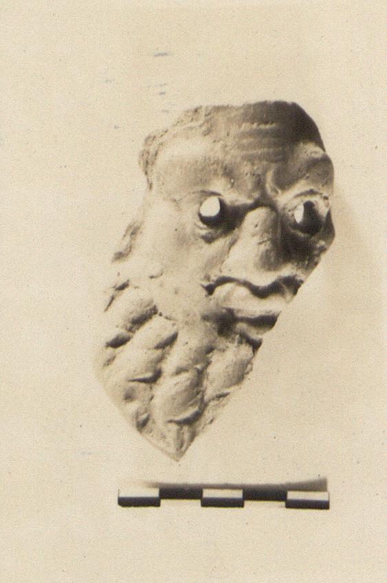 | Description: | Mask of bearded man with pierced eyes. Broken away at hair line and lower left side. Slight traces of white paint. Micaceous red clay. | |