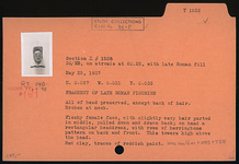 | Description: | All of head preserved, except back of hair. Broken at neck. Fleshy face, with slightly wavy hair, parted in middle, pulled down and drawn back. On head a rectangular headdress, with rows of herringbone pattern in back and front. This towers high above the head. Traces of reddish paint. Red clay. Late Roman. ADDENDA: Same mold as T 819 and T 1095. | |