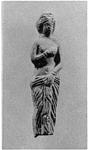 | Description: | Broken off above the feet. Partly draped figure, the drapery falling about her hips held by her left hand at the front; her right hand and arm held to her breast. Hair waved around the face done in a large chignon behind. Earrings indicated by dots; bracelets by grooves. No color. Pale buff clay. | |