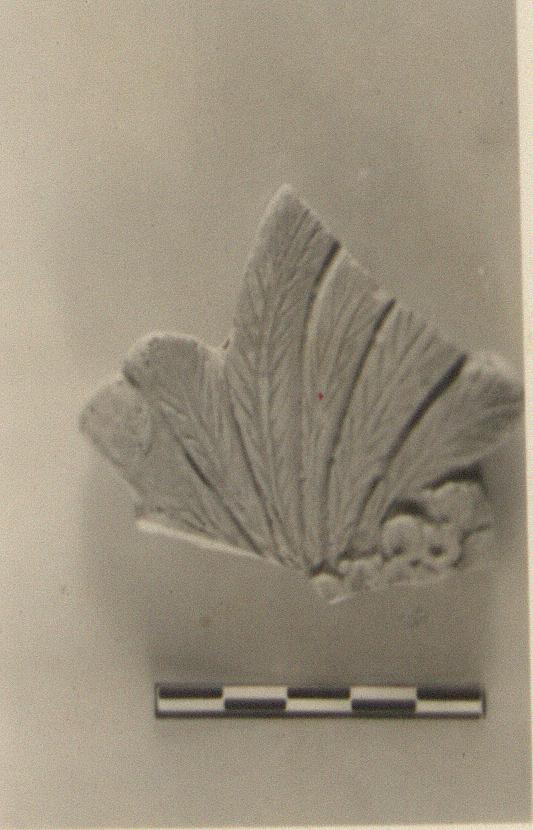 | Description: | First interpretation: wing. Flat palm, plain behind. Leaves moulded and incised. Dull red glaze or paint. | |