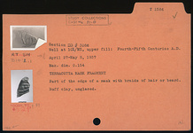 | Description: | Part of the edge of a mask with braids of hair or beard. Unglazed. Buff clay. | |