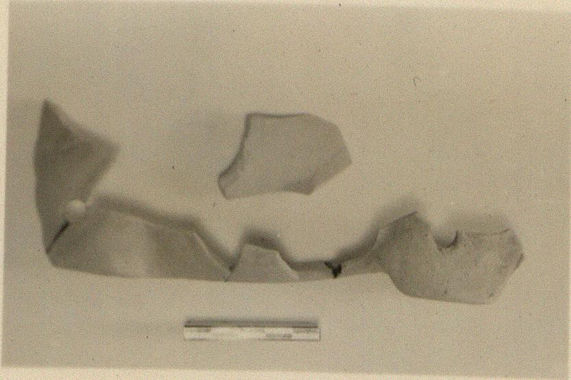 | Description: | Broken above; finished edge underneath. One small piece does not join. A round hole near each end. Thin fabric of micaceous warm buff clay. Probably a part of a toy horse, with wheels fixed to an axle through the holes at the ends, instead of legs. | |