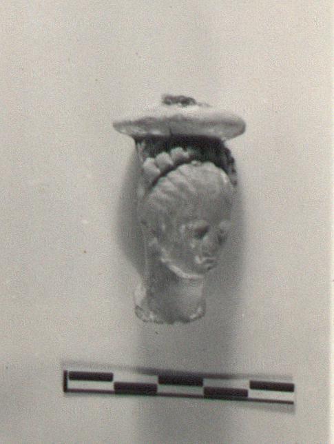 | Description: | On top of an elaborate coiffure the figure wears a large flat disk, in the center of which, on top, something is broken away. Remains of white and small traces of yellow on the white. Fine rubby brown clay. | |
