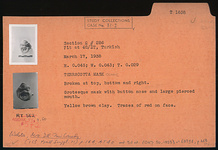 | Description: | Grotesque mask with button nose and large pierced mouth. Broken at top, bottom and right. Traces of red color on face. Yellow brown clay. | |