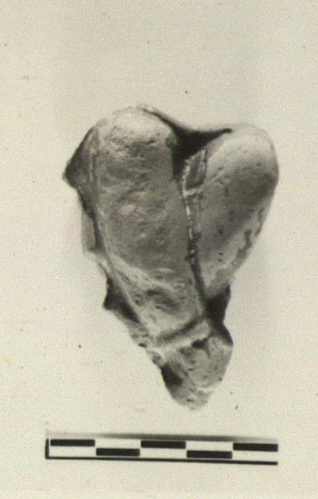 | Description: | Broken all around. The crossed legs of a figure, wearing shoes (?). The edge of a short garment preserved above the knees. Clay covered with thick red paint which has peeled. Red paint also inside. Red brown clay. Probably from a lamp. ADDENDA: C. Grandjouan: Comic actor. | |