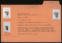 Figure wearing a cloak which falls down the front in two plain tapering bands bordered dy ridges. At the lower left of the figure as preserved, an attachment is broken away: lamp (?).