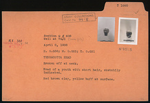 | Description: | Broken off at neck. Head with short hair. Hair sketchily indicated. Red brown clay, yellow buff at surface. | |