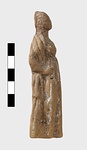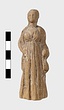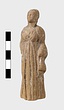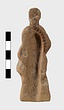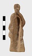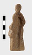 | Description: | Complete. The figure wears a straight high-girted chiton, and a shawl over her shoulders. Her right hand rests on her hip; in her left she seems to be holding a log-like object (perhaps only one fold of cloak ?). Her hair is dressed in melon-waves, with a braid (?) around the back of the head. Mould-made; back unmoulded, but hollow where pressed into mould. Many traces of white color. Yellow-buff clay. | |