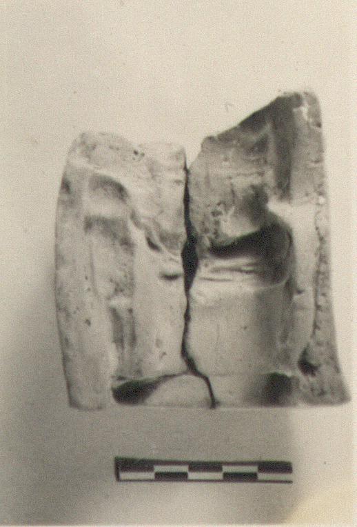 | Description: | Broken off above, mended from two pieces. Mold for a figure beside whom stands a small child. The mold seems to be part for the back part of the figurine, showing a plain bench or rock on which the figure sits, heavy folds of drapery at the hips, and part of the back. The child appears to be standing sideways, at the figure 's right. Pink to buff clay. Tabs outside. | |