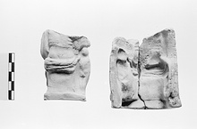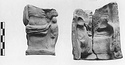 | Description: | Broken off above, mended from two pieces. Mold for a figure beside whom stands a small child. The mold seems to be part for the back part of the figurine, showing a plain bench or rock on which the figure sits, heavy folds of drapery at the hips, and part of the back. The child appears to be standing sideways, at the figure 's right. Pink to buff clay. Tabs outside. | |