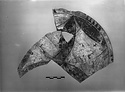 | Description: | About half preserved; mended from many fragments; two others do not join. Remains of attachment of arm and hand straps. Carefully laid out design, formed by intersecting arcs, which make the petaled-like ornament, and a series of large scallops which connect the points of the six petals, next the rim; these also in alternating red and blue, as are the triangles on the margin, in groups of five and six. Both red and blue laid over the white off the ground, the blue much less well preserved than the red. Inside, dark red. Pink clay. Cf. The shields device on a Geometric sherd: National Museum no. 283. | |