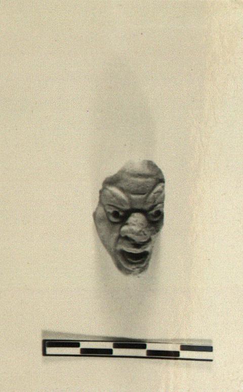 | Description: | Face only preserved. A thin faced fellow. Remains of dark red wash. Light red clay. Probably a plastic lamp. Cf. other lamps from this well. | |