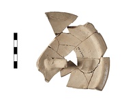 | Description: | Fragmentary shield. Part of the right side and center of the shield preserved, with remains of arm strap on back. High convex shape with sharply offset rim. Remains of winged horse with rider (?) left: horse and margin in red, rider, exergue and part of backround blue. The rider has a red helmet with flying crest. Both red and blue pigment laid over white ground; and the blue of the rider 's body over the red of the horse. Buff clay. Cf. Chase (1902), HSCP 13 , p. 110. | |