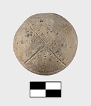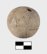 | Description: | Pierced horizontally near top. It has incised filled decoration. Pattern mostly in seam motif: lines bordered by rows of dots. Zone round center in seam line, zigzag. Four seam lines alternating with four plain rows of dots radiate from above and below to meet borders of zone. Traces of blue paint (?). Buff clay. Cf. MC 1109 and MC 1110. | |