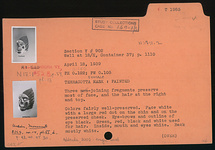 Colors fairly well-preserved. Face white with a large red dot on the chin and on the preserved cheek. Eye-brows and outline of eye black. Green, red, black and white used for hair. Inside, mouth and eyes white. Back mostly white.