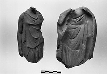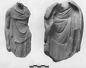 | Description: | Mold for front part of figure on a fairly large scale. Broken at top and bottom; original edge preserved at both sides. The head is missing, the left hand and most of the right, and all below the knees. The figure stands turned slightly to her left, her right hand hanging at her side, her left arm bent at the elbow and the hand extended; the weight is on the left leg. She wears a Doric chiton with long ungirt overfold. At the left side of the mold is a Γ-shaped slot, perhaps intended to form a joint with the mold for the back. Marks in the wet clay outside, Λ , may possibly be a signature (?). Dark pink clay. ADDENDA, H.A. Thompson: The Γ-shaped slot at the left side of the mold is simply finger hold. D. Burr-Thompson: The mark Λ is not a signature. | |