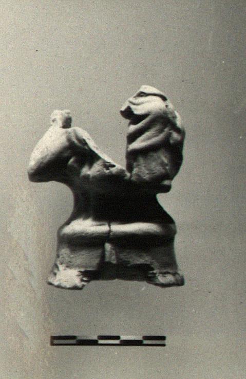 | Description: | First interpretation: draped bust (?) on circular moulded base. Head and most of shoulders missing. Open beneath. Pinkish to buff clay; pale buff surface. ADDENDA: C. Grandjouan: Aphrodite riding goose. Early Roman. | |