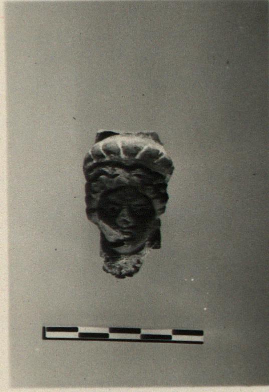 | Description: | Broken behind. Face framed by heavily waved hair surmounted by a thick fillet or cap, a projection at the back above (for handle ?). Eyes pierced. Considerable remains of white over, on headdress and neck. Light red to buff clay, with thick dull red wash. | |