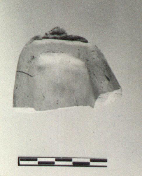 | Description: | Half of one end of a mold for a rounded undecorated object. Tab and string grooves at end outside. Light greenish-buff clay. Possibly the back of head (?) ADDENDA: Lamp nozzle (?) | |