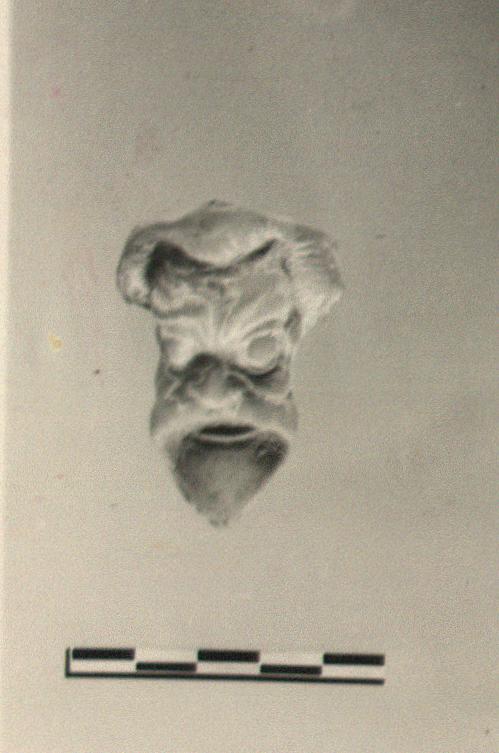 Long pointed beard; cheeks bulging at corners of mouth; blunt nose and popping eyes; irregularly arched eyebrows. Pierced at either side at point where ear should be, for suspension, and a third hole through the flat top.