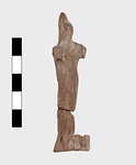 | Description: | Mended from two pieces; arms missing from shoulders. Lower and smeared against part of a continuous narrow base. Pinched bird-like head. Indication of drapery down front. Back plain. Traces of white color. Pink clay. | |