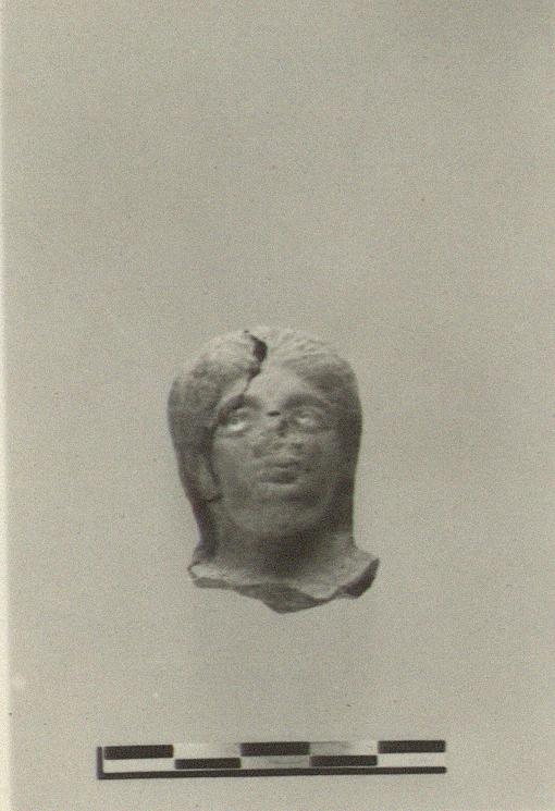 | Description: | Front of head only preserved. Hair parted in middle and covering ears. Red wash, purplish on the hair; added white for eyes. Orange clay. | |