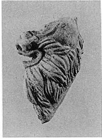 | Description: | Fragment preserving the lower left side of face and beard of small grotesque mask. Rather carefully made. Traces of red color on his face and lips. Buff clay. | |