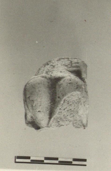 | Description: | First interpretation: upper part of torso of grotesque female. Consider also other way up: seated figure with knees drawn up (?) Her right hand on her bell, pendent breasts exposed above her dress. Pinkish wash for flesh, white for dress. Pinkish-buff clay. ADDENDA: C. Grandjouan: Comic actor: seated "slave on altar", because ankles starting to cross and drapery angle. Cf. T 1655. | |