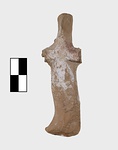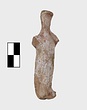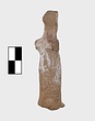 | Description: | Arms missing. Broken from plinth (?) Bird-like face, with traces of blue color. The broken arms extend sideways. Painted white with red details. Pinkish buff clay. Very irregular possibly from a horse group as the no. T 420. | |