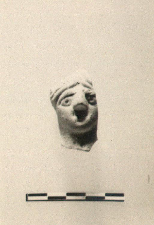 | Description: | Broken away behind, at top of hair and at base of neck; part of left side of face missing. Hair parted in center, drawn down over brows in loose waves. Nose, mouth, eyes and dimpled chin sketchily done with very little modelling. Gouged technique. Traces of red paint on lips and neck. Brick-red clay. | |
